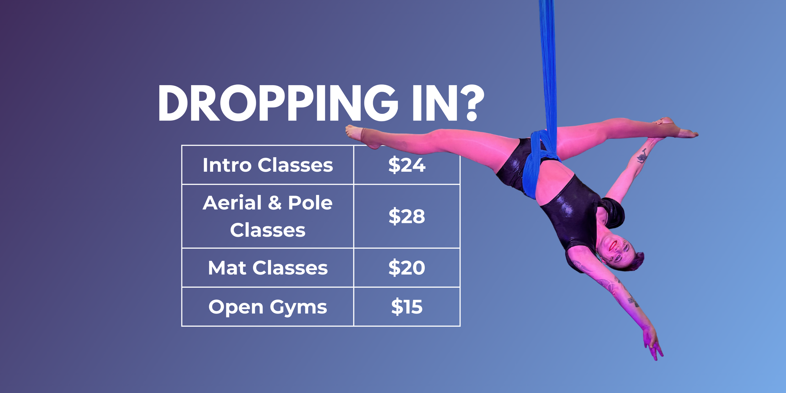 *Includes all Mat Classes, Intro to Aerial, Intro to Pole, and any Level 1 or All Level aerial or pole classes for adults only! Expires 15 days after your first class booked with the special (not 15 days after purchase).