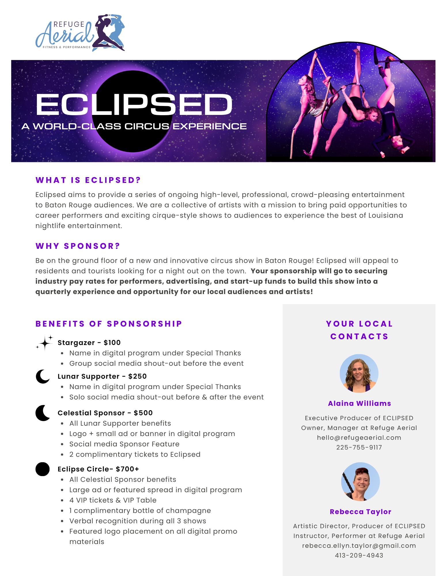 Be on the ground floor of a new and innovative circus show in Baton Rouge! Eclipsed will appeal to residents and tourists looking for a night out on the town. Your sponsorship will go to securing industry pay rates for performers, advertising, and start-up funds to build this show into a quarterly experience and opportunity for our local audiences and artists!