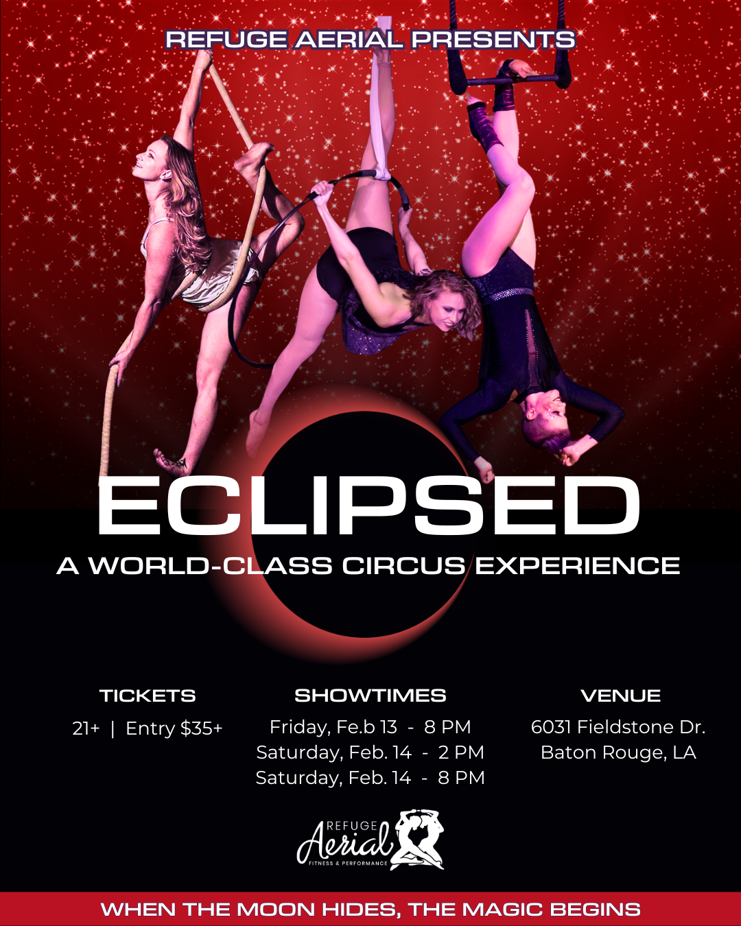 Eclipsed aims to provide a series of ongoing high-level, professional, crowd-pleasing entertainment to Baton Rouge audiences. We are a collective of artists with a mission to bring paid opportunities to career performers and exciting cirque-style shows to audiences to experience the best of Louisiana nightlife entertainment. If you love the arts or our artists, help us promote the show!